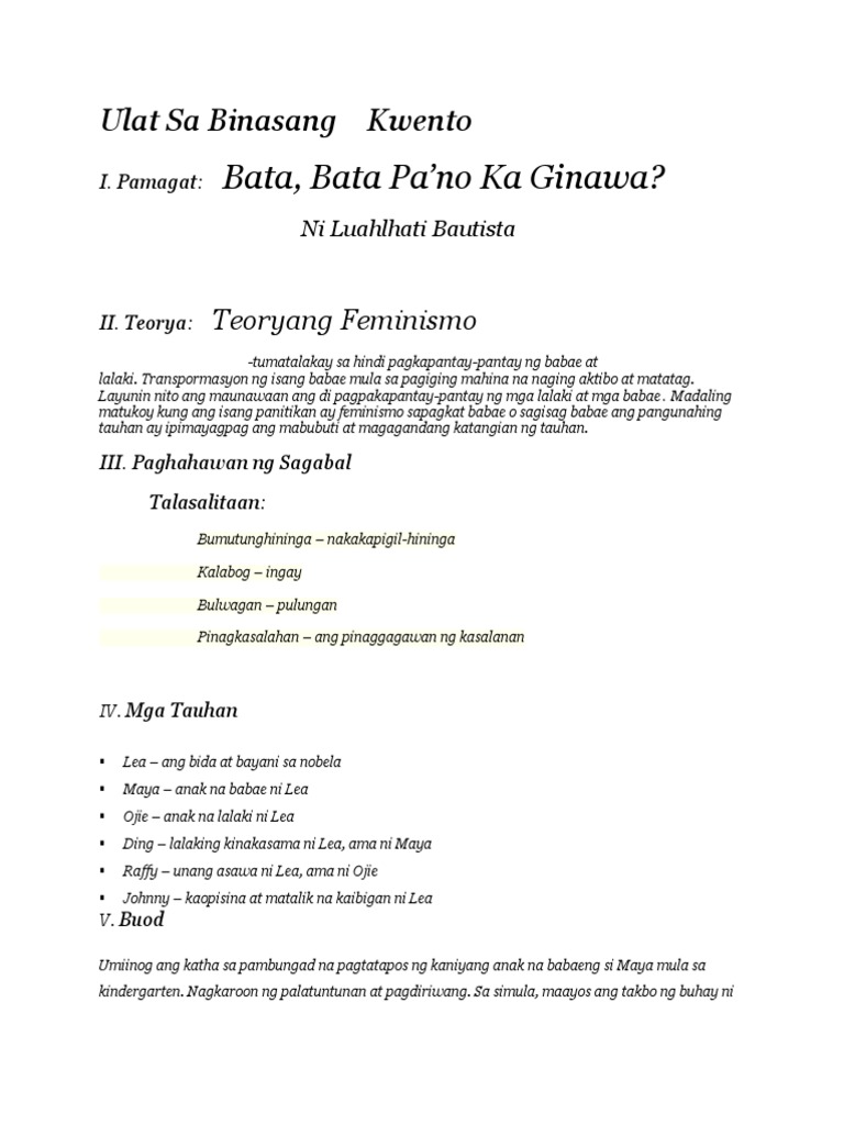Ang Bu od ng Nobelang Bata Bata. Ang nobelang Bata BataPano ka Ginawa ni Lualhati Bautista ay gumamit ng dulog na Feminismo sapagkat babae ang pangunahing tauhan ng nobela ipinakita sa nobela kung gaano katatag si Lea sa mga pagsubok na dumating sa kaniya naipakita rin ang kaniyang pagmamahal sa kaniyang dalawang anak na kung saan na kahit na may posibilidad na sumama ang. Suring pelikula Tuesday January 15 2019.