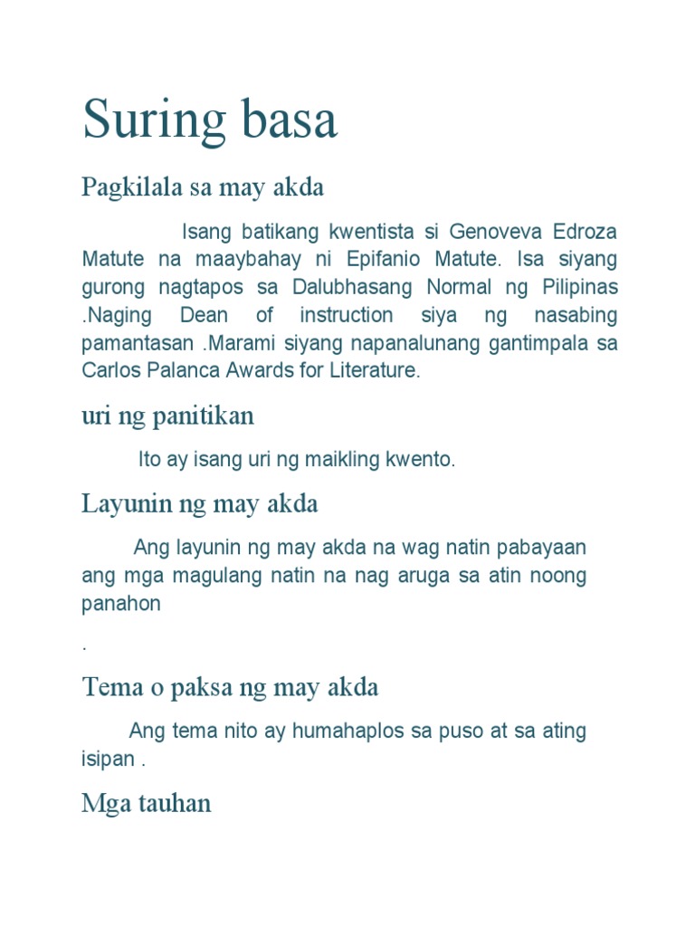 Ang ama suring basa. Maaaring ang sinusuring teksto ay isang kwento o maikling kwento sanaysay tula at iba pang uri ng panitikan. Gumawa ka na lamang ng saranggola wika ng ama. Maaari ding isang pelikula.