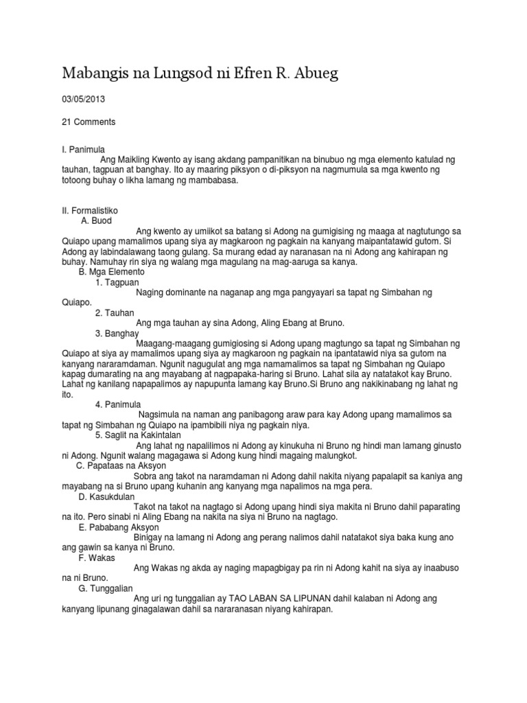 Abueg Ang gabi ay mabilis na lumatag sa mga gusali lumagom sa malalakit maliliit na lansangan dumantay sa mukha ng mga taong pagal sa mga taong araw-araw ay may bagong lunas na walang bisa. Ito ay maaring piksyon o di-piksyon na nagmumula sa mga kwento ng totoong buhay o likha lamang ng mambabasa. PAMAGAT Mabangis na Lungsod MAY AKDA Efren Abueg 1Pagkilala sa may akda-Si Efren Abueg ang isa sa mga iginagalang na nobelista kuwentista mananaysay at krititiko ng kaniyang panahon.