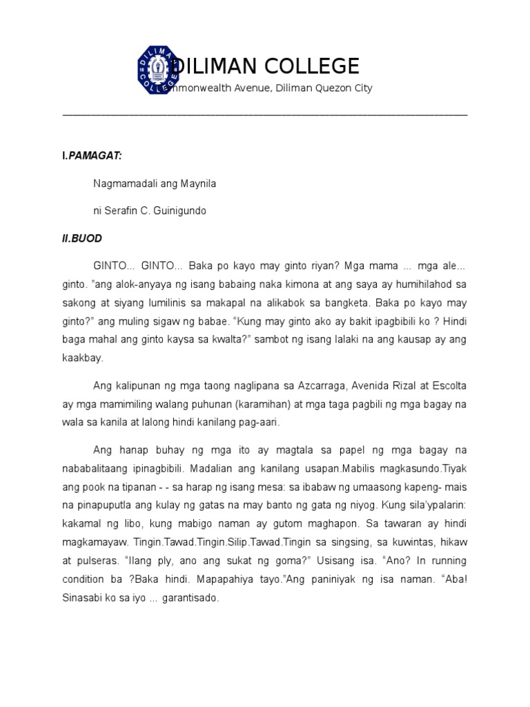 Serafin Gunigundo - Nagmamadali ang Maynila Antonio B. Ang mga nagtatayugang gusali ay tila nagbabantang umabot sa rurok ng langit. Batay sa akda na nagmamadali ang maynila ang pamumuhay doon ay karamihan ay walang puhunan at mga mamimili na hindi kanilang pag mamayariAng kilos doon ay lahat mabilis ang kanilang transaksyon yung tipong hindi na kailangan ng mga dokyumento na nagpapatunay na ipinagbibili na ang mga bayagKaramihan sa mga ito ay ganoon ang mga.