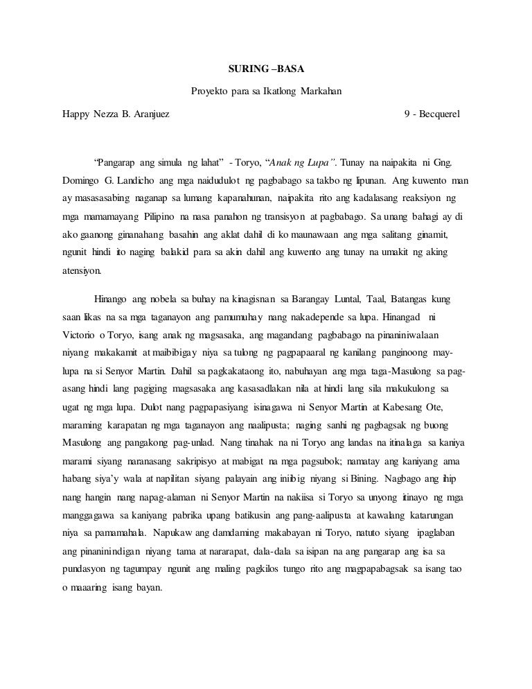 2Bago isulat ang suring-basa ng isang akda gumawa muna ng sinopsis o maikling lagom. Apat na beses siyang bumalik sa palengke upang kumuha pa ng mga ibang walang ginagawa. Pinakikita din dito ang kahalagahan ng akda.